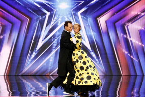 Pasha left the stage briefly. Howie was perplexed, “how is he going to compete without his wife?” Then Terry Crews came out on the stage wheeling-out what looked like two dance mannequins. One female, and one male that looked just like Pasha. The mannequins danced and were obviously being controlled from underneath.